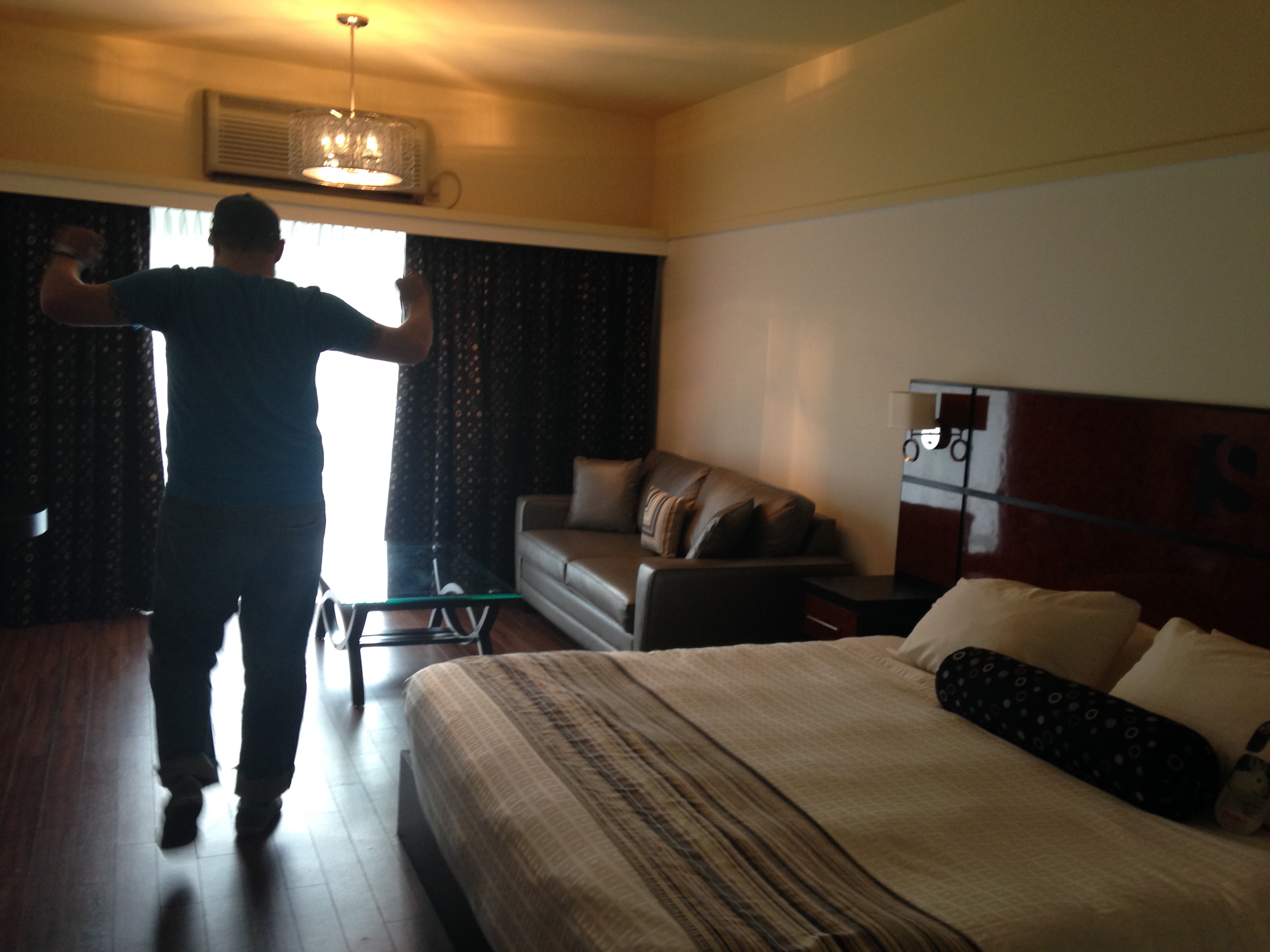 My dad booked us a room at a hotel just down the road from John and Connie (called Samuels) and we were lucky to get upgraded to a room overlooking the river. It was very nice. Just look at Kirby jumping for joy!