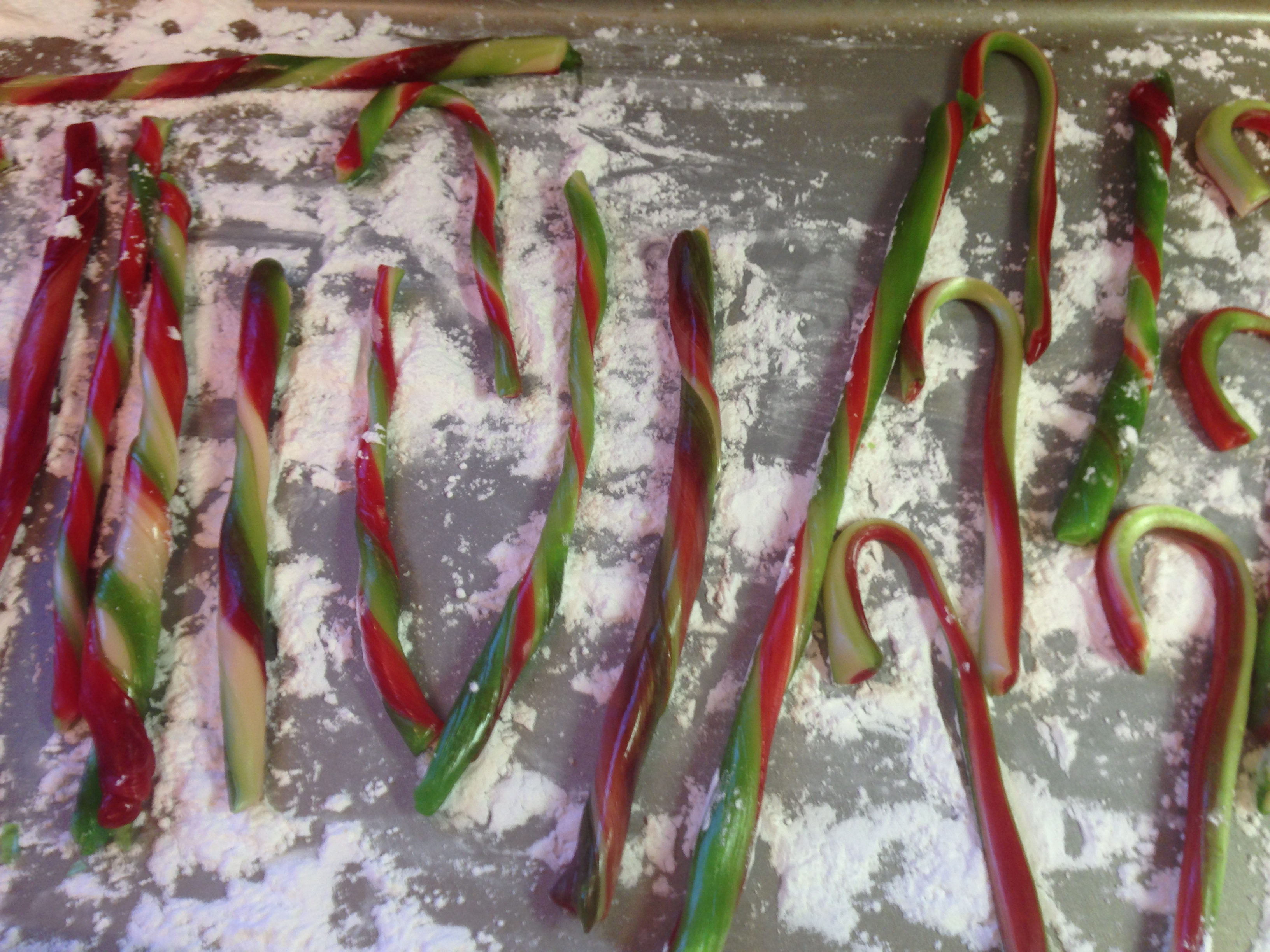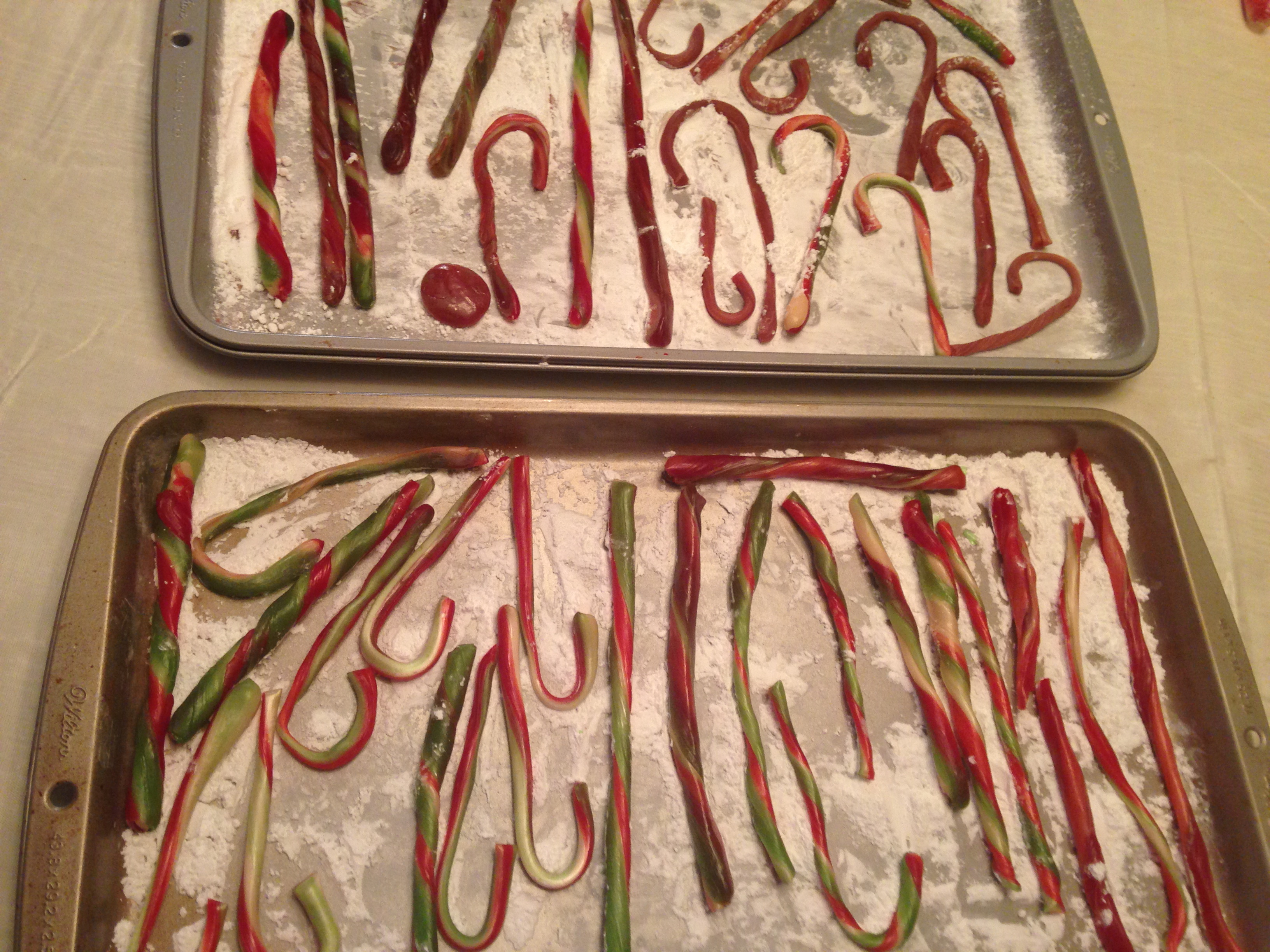 And as we went along, the candy would harden and we would have to place them back in the oven. Eventually this meant the colours ran together and it got harder to achieve the stripe candy cane look. But all-in-all, I have to say, I’m pretty impressed with what we were able to make!