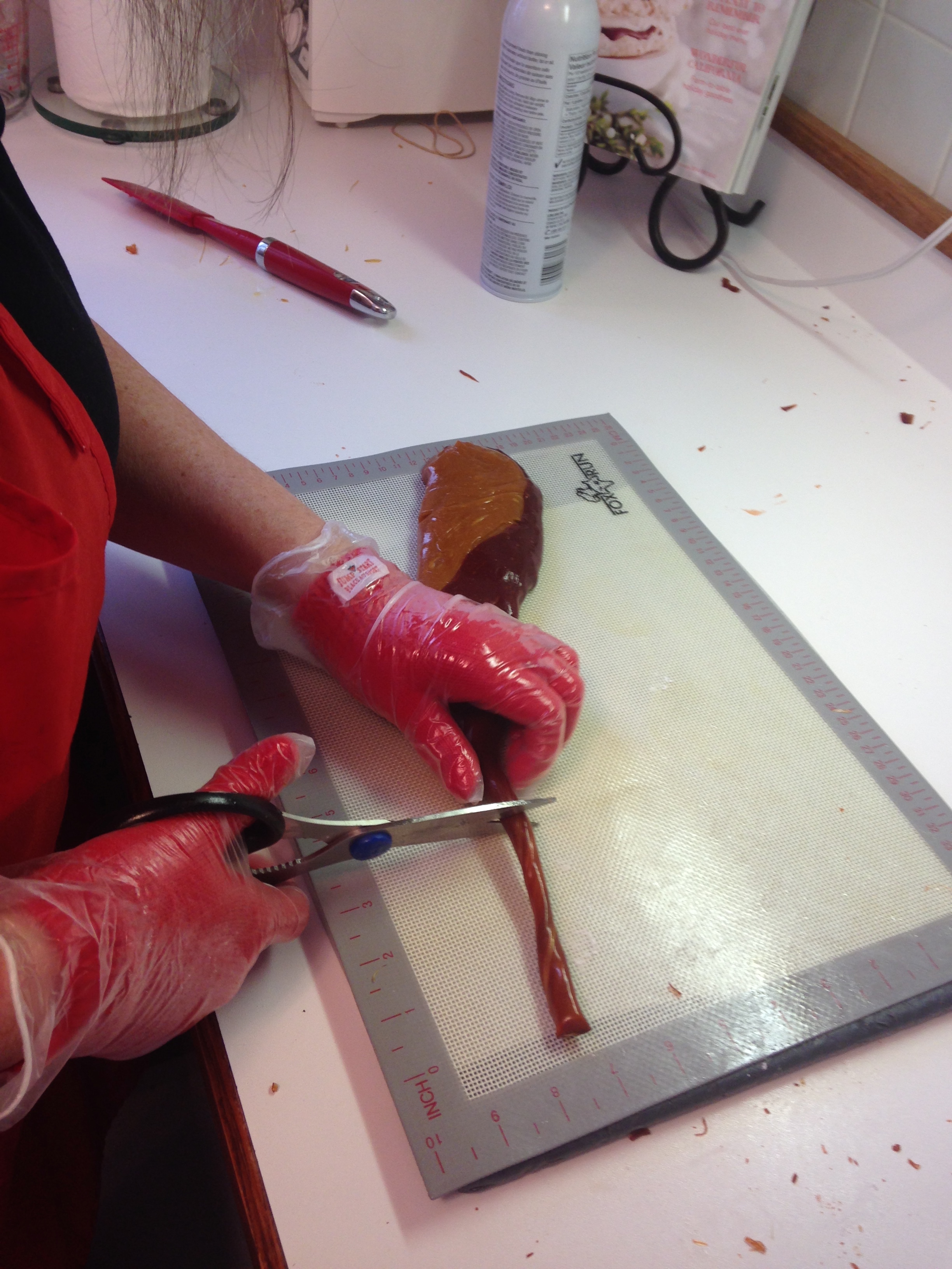After we finished making the Cinnamon Butter we started on our candy canes. This year we decided to make caramel flavoured and coloured canes. Once again, we used the same recipe as last year with caramel flavour and colour substitutes. We had a hard time getting the candy to 280 degrees and we weren’t sure if it was the candy thermometer giving us a trouble, or if we didn’t have the heat high enough, but I think next year we might get a digital thermometer.