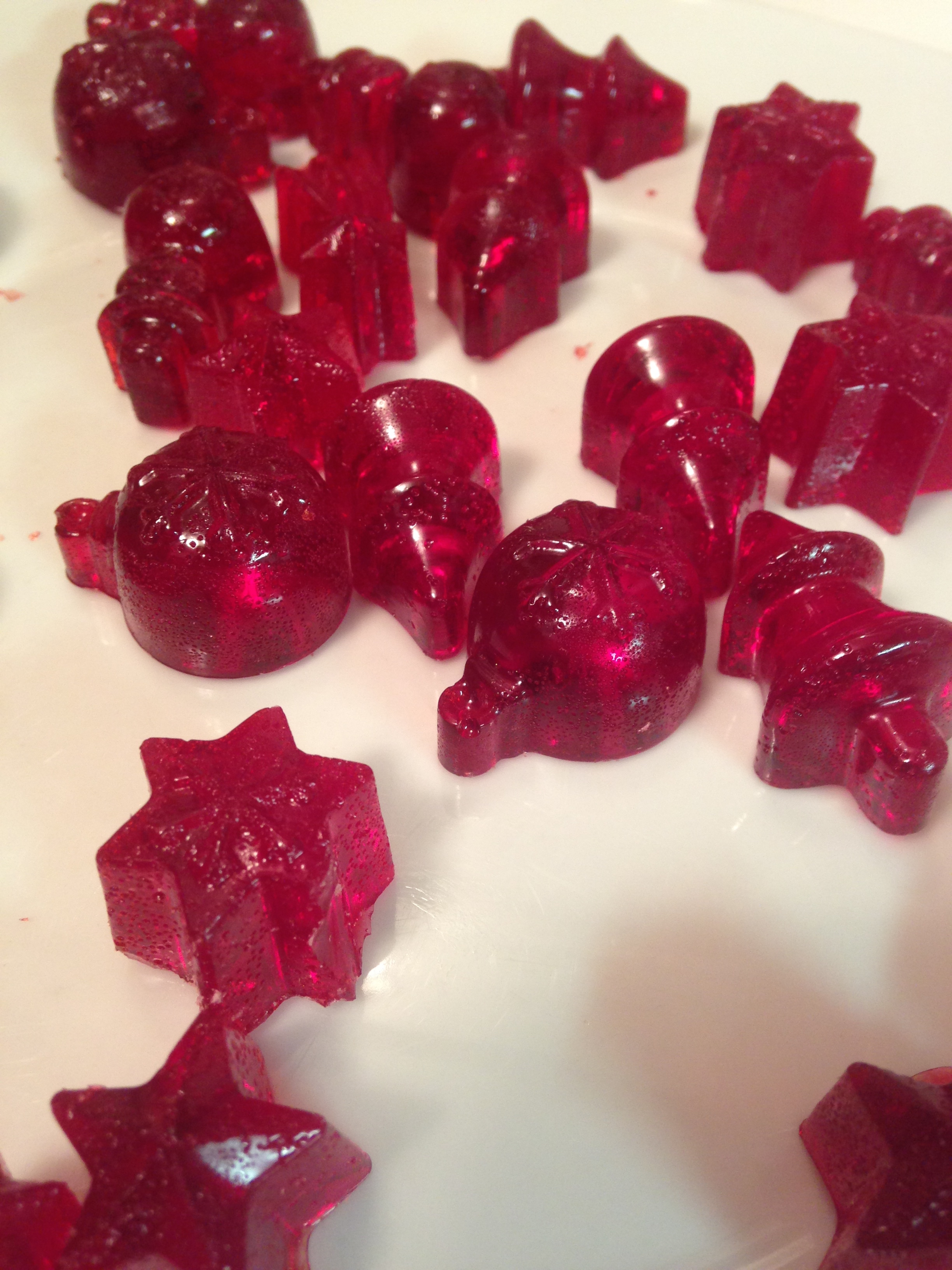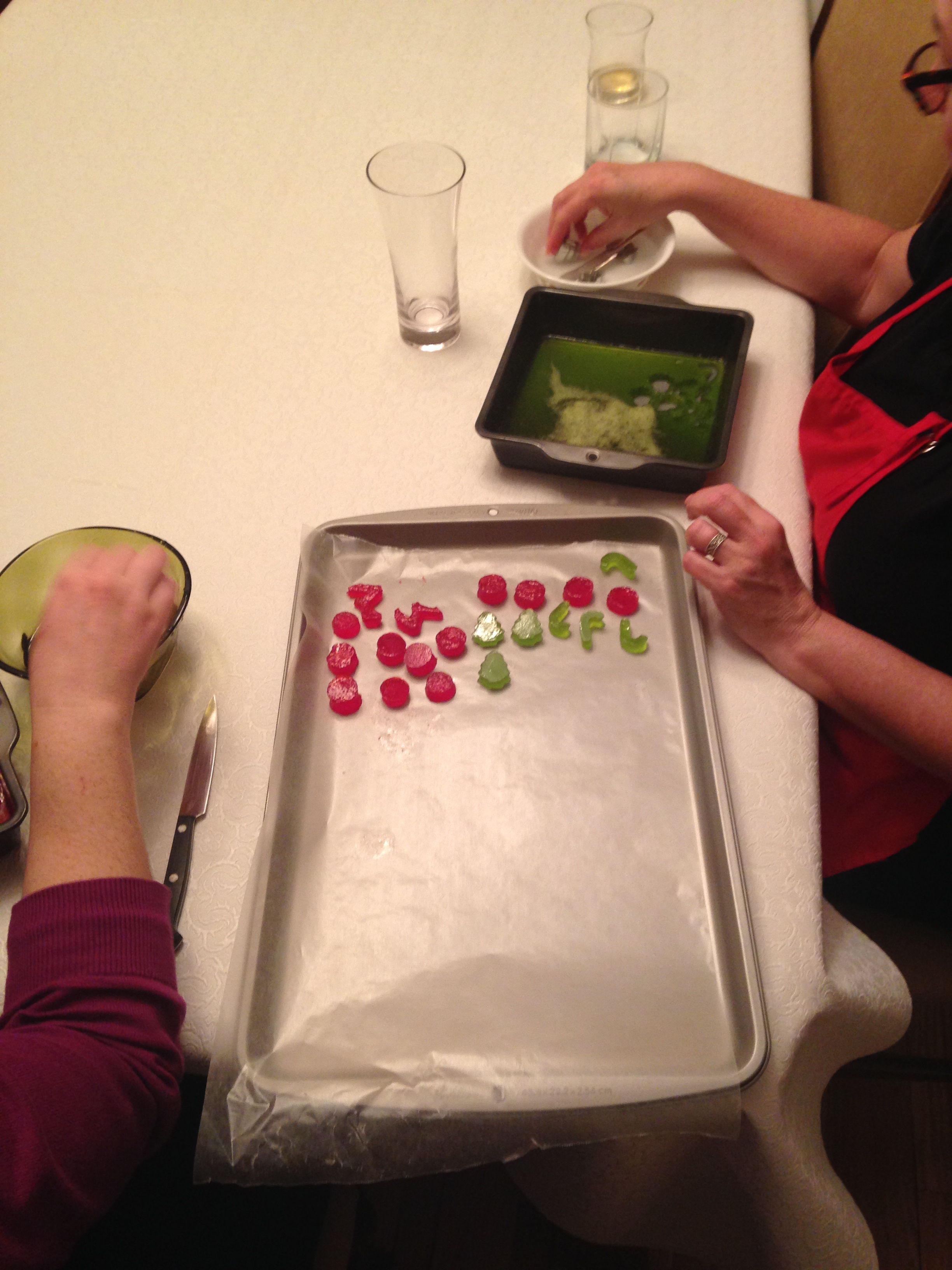 After the canes were set to dry, we got started on the homemade gumdrops (recipe found here). We made a batch of red and green and left them to solidify.