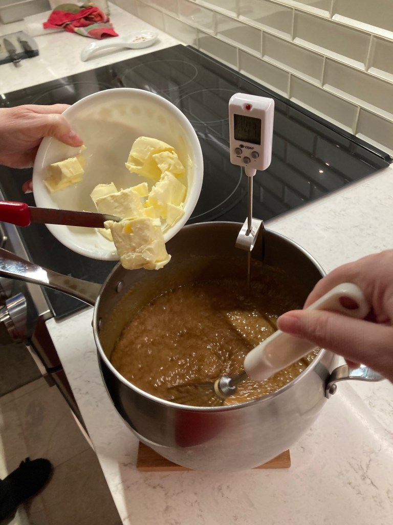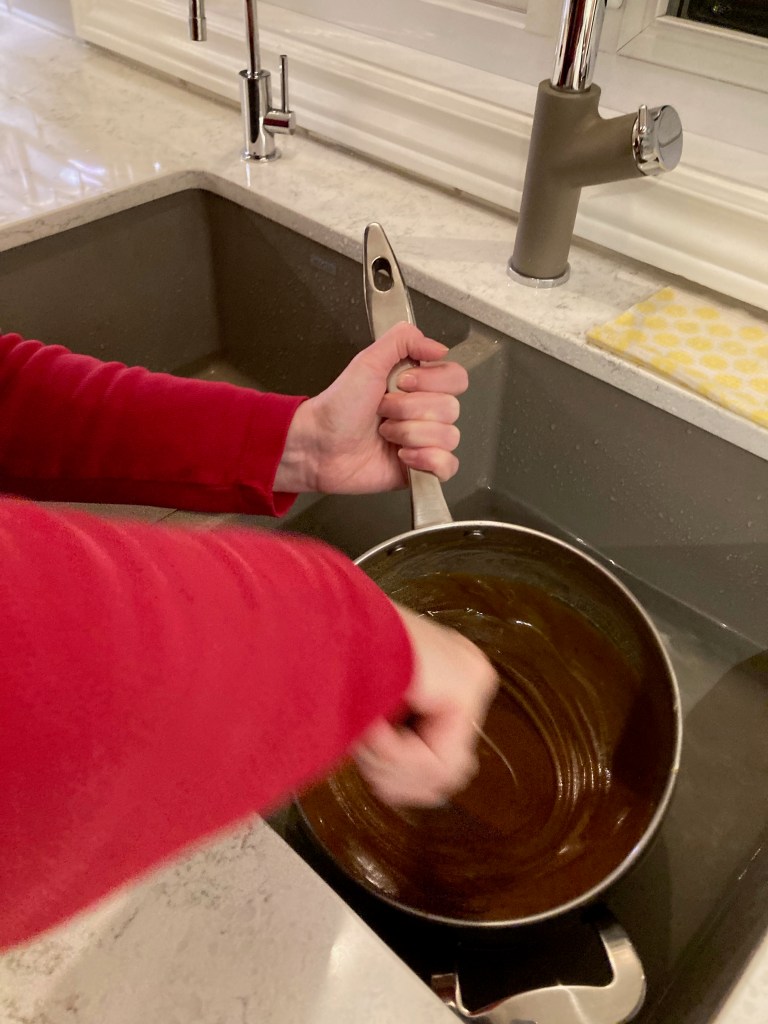 We removed it from the stove and added the butter then left the pot in the other room to cool to 120°f as per the recipe. But we waited and waited and the mixture just wouldn’t cool. After doing some googling we decided to cool the fudge by whisking it in a cold water bath.