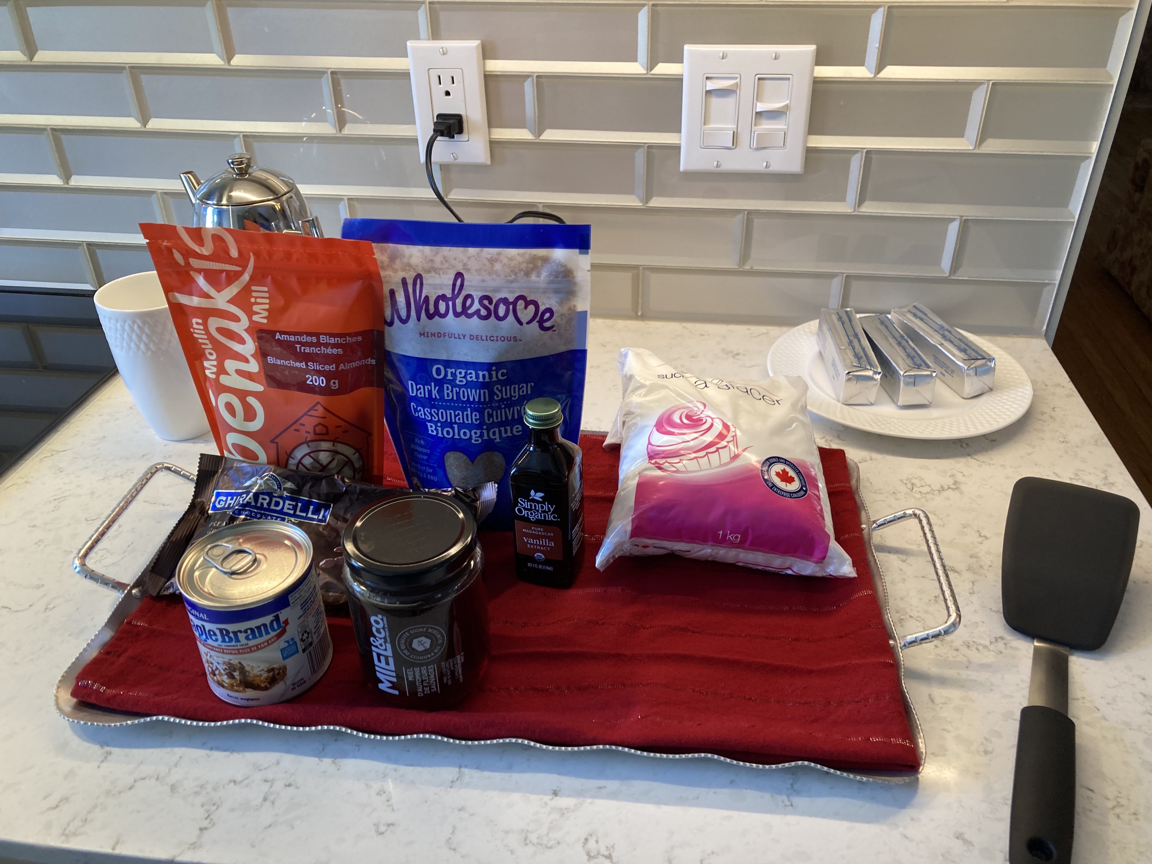 As per our tradition, earlier in December Kirby and I made the day trip to Montreal so Sylvie and I could do our Christmas baking and crafting. We started the day by getting ourselves organized and making Millionaire Shortbread.