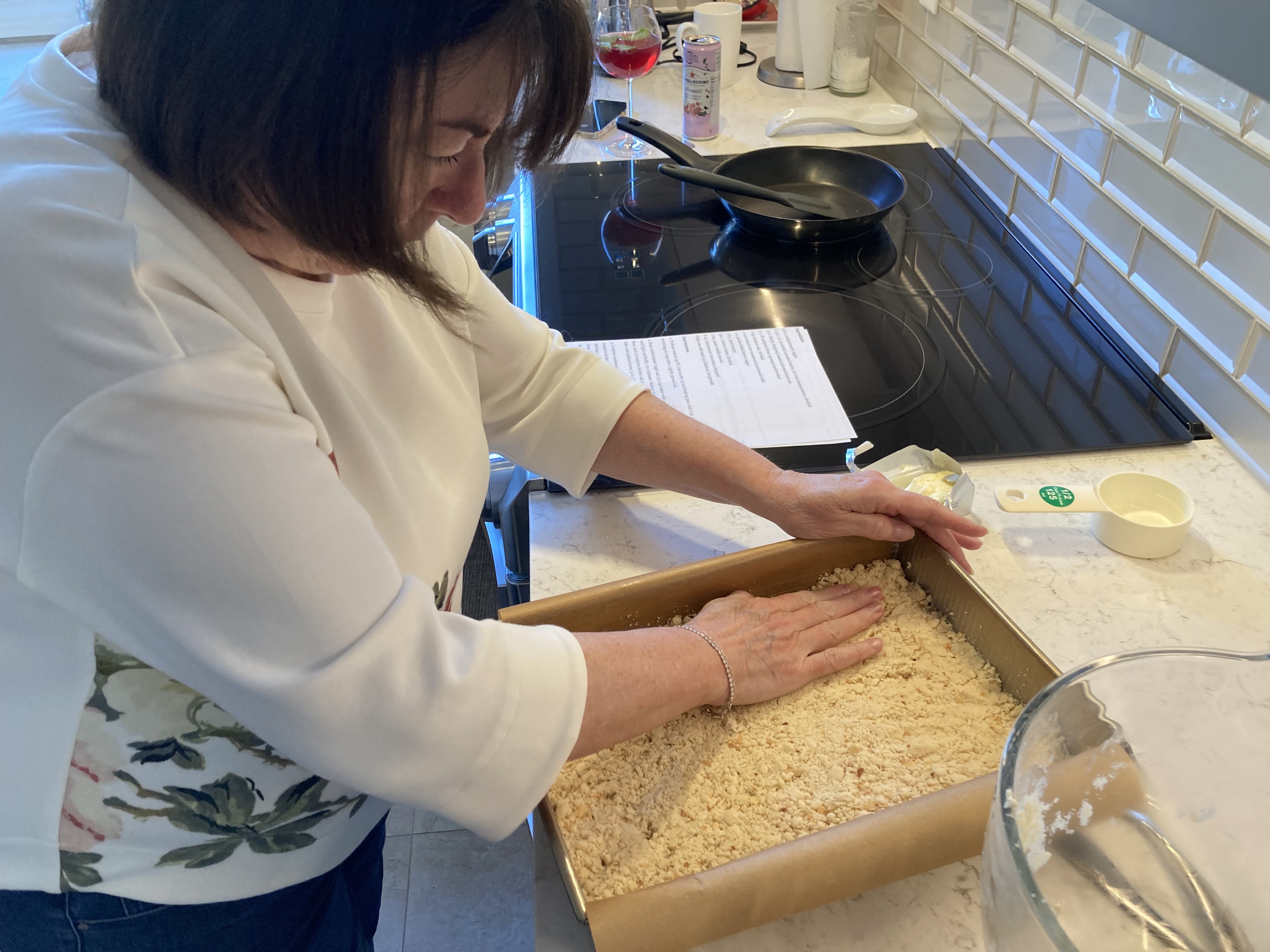 Once the chopped almonds were incorporated we firmly pressed the dough into the bottom of the pan and set it to bake.