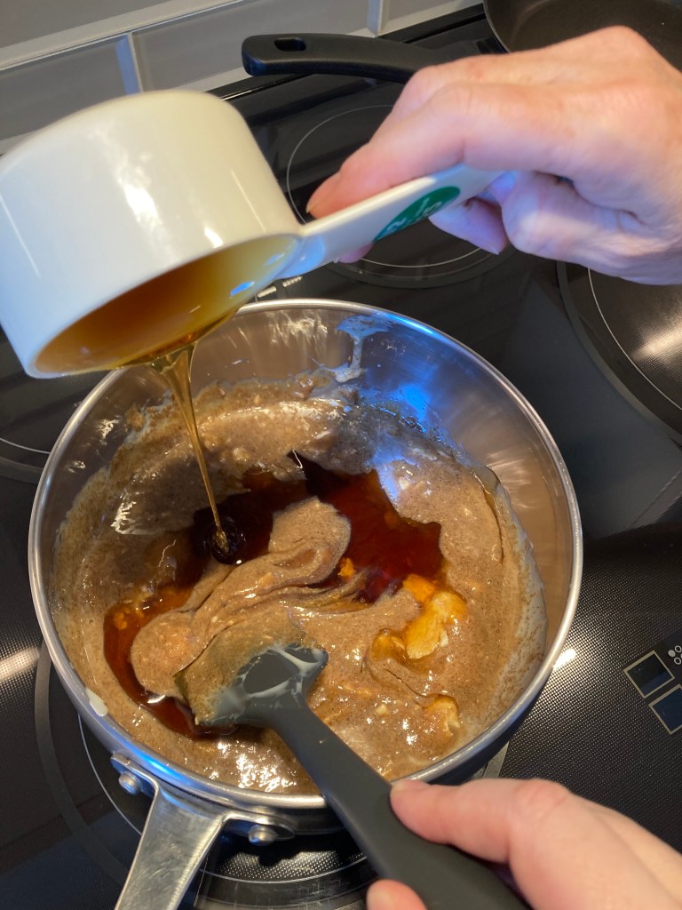 This boiled for almost 30 minutes which gave us time to cool the shortbread layer enough to pour the caramel. It probably goes without saying, but the caramel layer is the most important element to get right. If you over-cook it you’ll end up with a caramel that is too tough and chewy. But if you under-cook it, the caramel will be too soft. I’m pleased to say we nailed it on our first try.