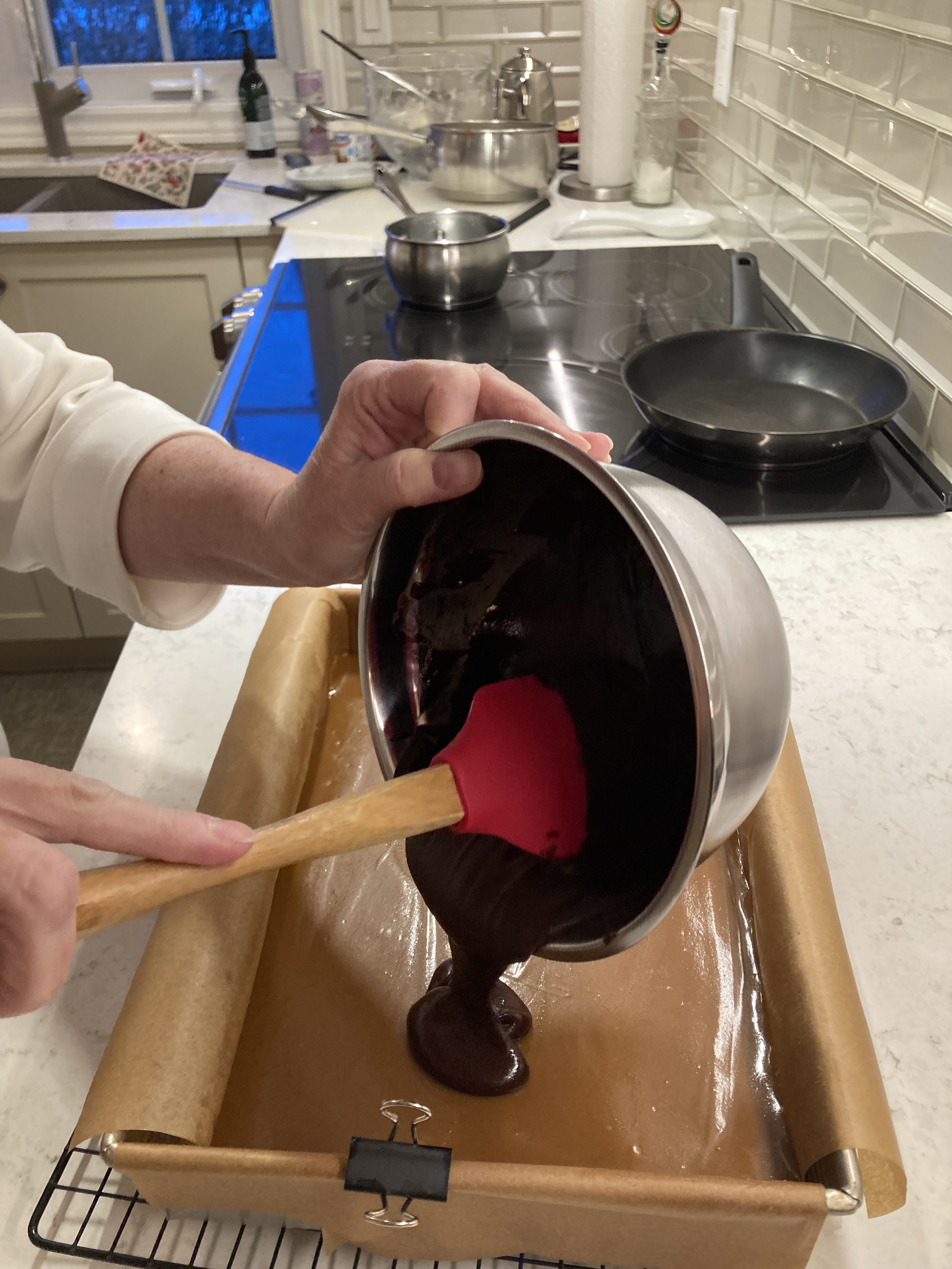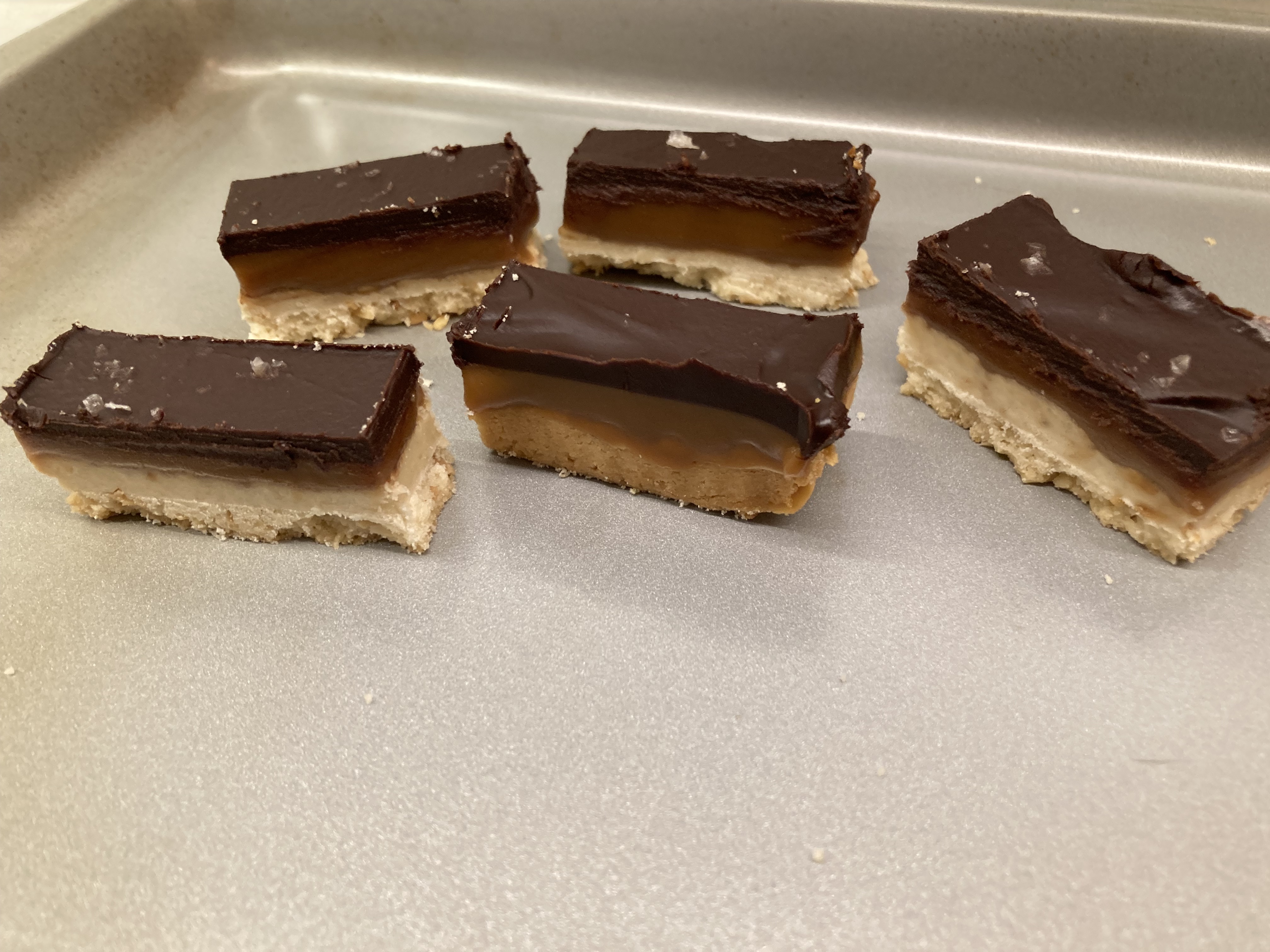 Once the caramel set on our shortbread, we melted the bittersweet chocolate with some butter and spread it on top.
